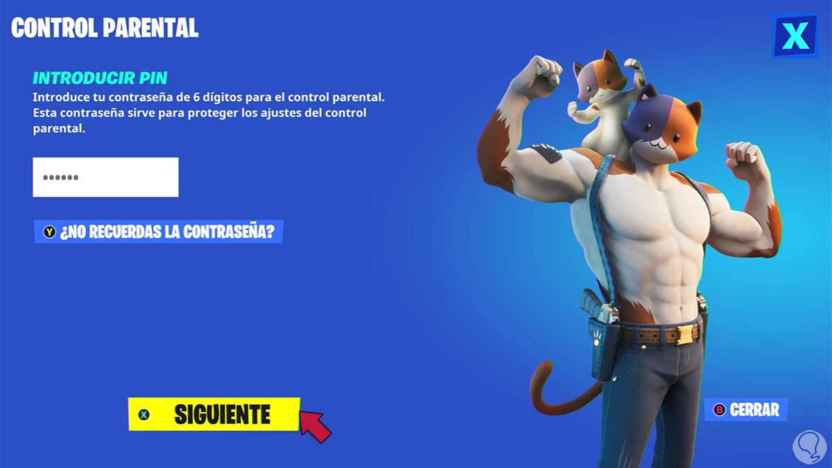 Introduce el PIN de seguridad configurado al activar el Control parental. Pulsa en "Siguiente" o X.