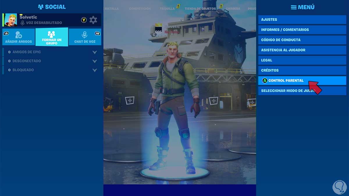 Lo primero será con el botón del mando de 3 rayas desplegar nuestro menú de Fortnite. Aquí entraremos en “Control parental”.