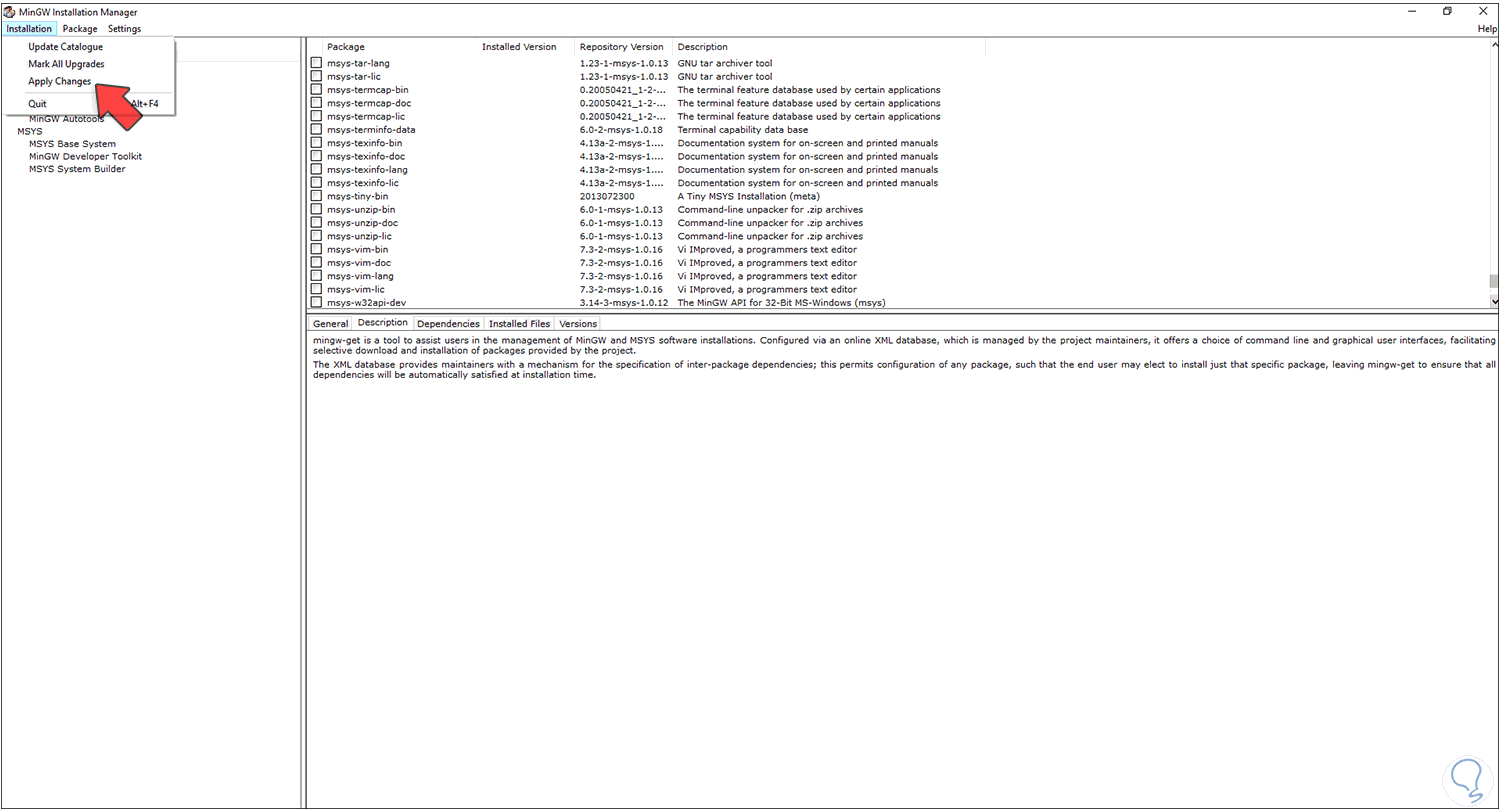 Una vez marquemos los componentes a eliminar, iremos al menú “Installation” y allí seleccionamos “Apply Changes”: