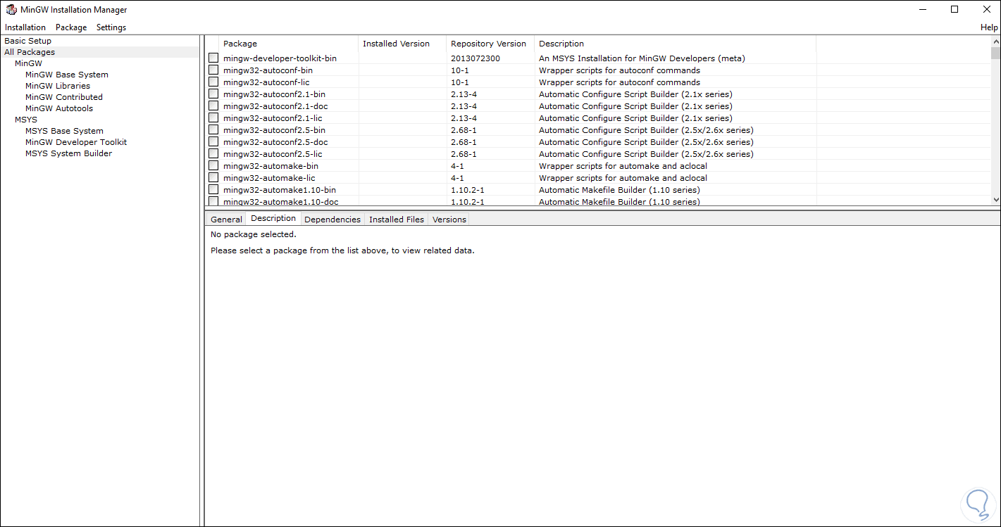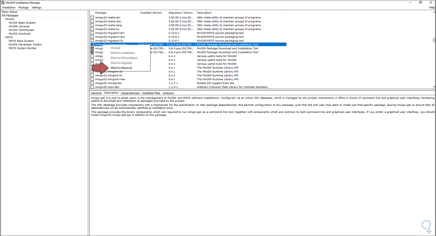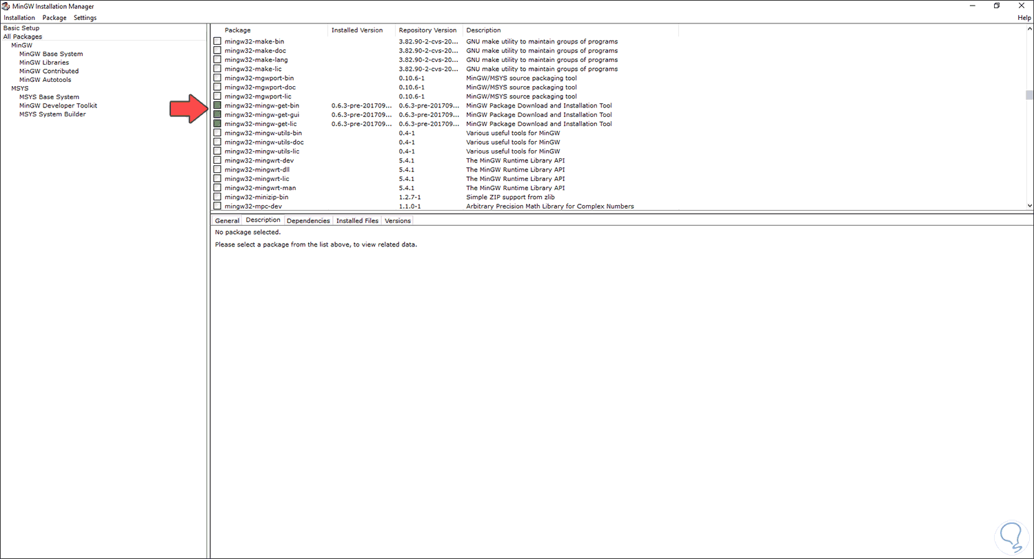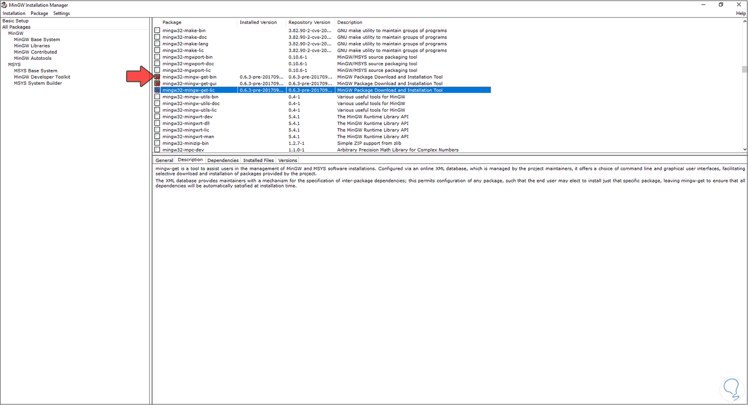 En el panel central ubicaremos los componentes de MinGW que están marcados, estos son los que están activos en tiempo real en el sistema:
