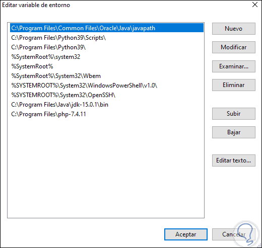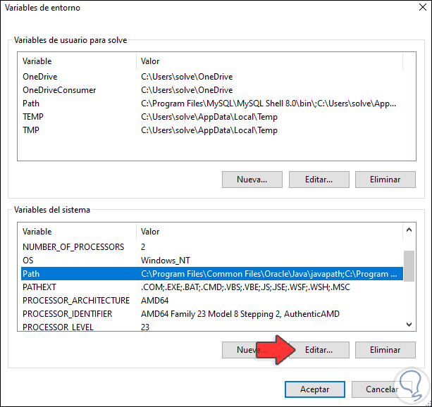 Damos clic en “Variables de entorno” y será desplegado lo siguiente, allí vamos a la sección “Variables del sistema” y seleccionamos la línea Path: