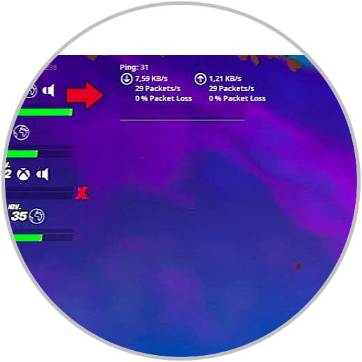 Desde este momento veremos que ya nos aparece el Ping en la parte superior izquierda de la pantalla mientras jugamos a Fortnite, así como información de red en tiempo real.