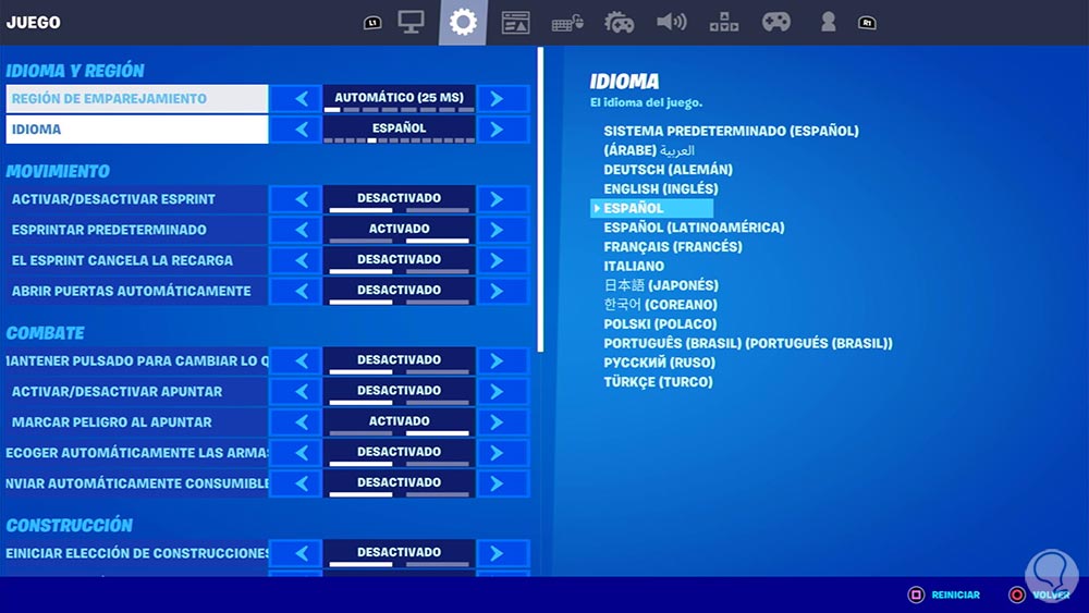 Cambiar idioma Fortnite PS5 o Xbox Series X o S