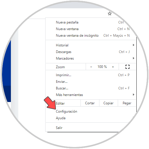 Ahora, damos clic en el menú “Personaliza y controla Google Chrome” y vamos a “Configuración”: