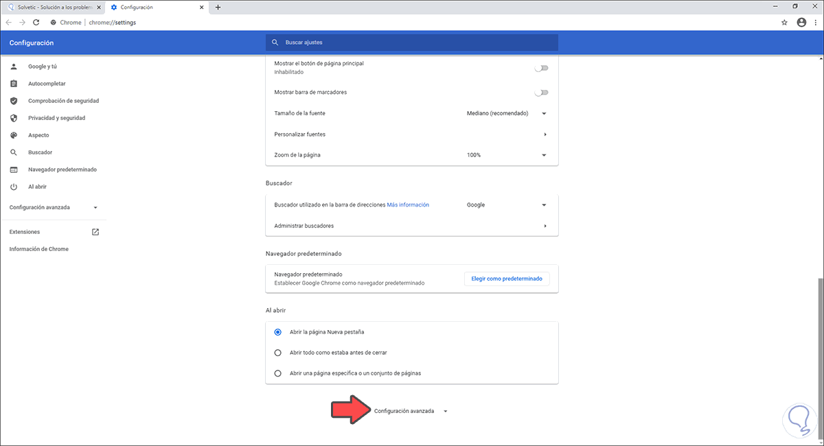 En la ventana desplegada vamos a la parte inferir donde veremos lo siguiente. Damos clic en “Configuración avanzada”