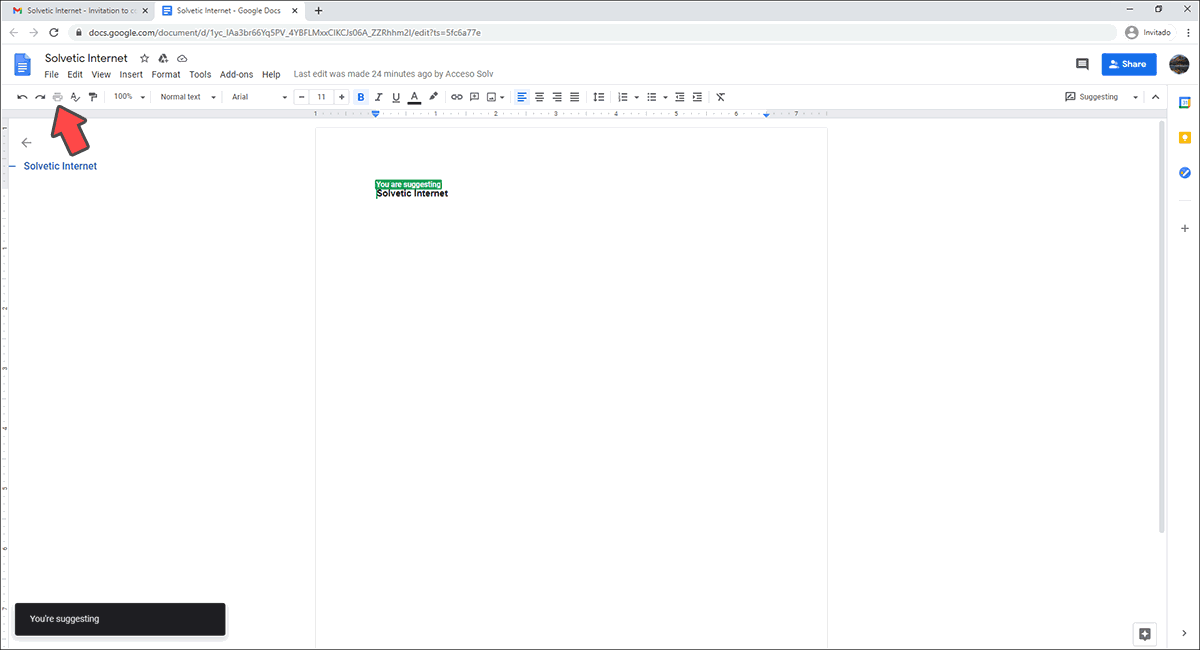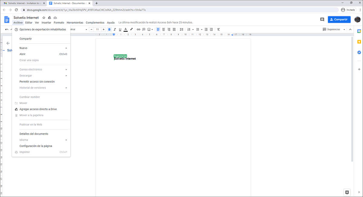 Dará clic en el botón disponible (según el tipo de archivo) y en este caso el archivo se abrirá en Google Docs, podemos ver en la parte superior que la opción de imprimir esta desactivada: