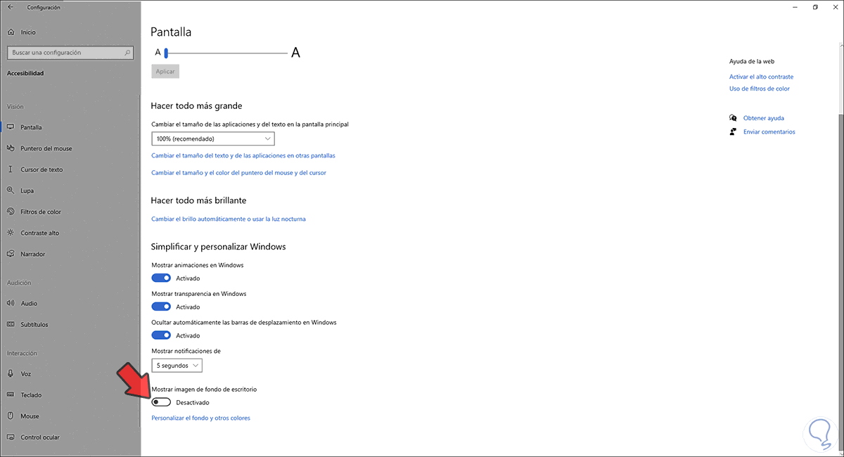 Vamos a la sección de Accesibilidad y allí iremos al campo Pantalla, en la parte inferior encontramos el interruptor “Mostrar imagen de fondo de escritorio”: