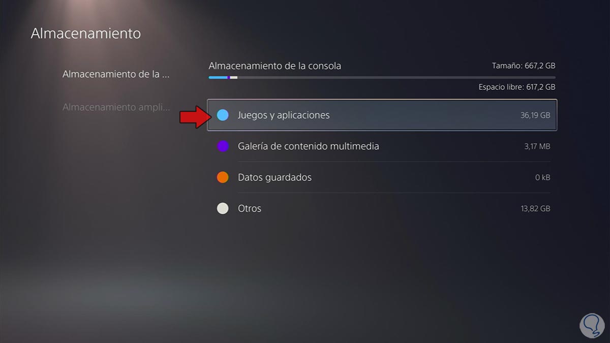 Ahora verás un menú lateral. Pulsa sobre "Almacenamiento de la consola". Lo siguiente que debes hacer es entrar dentro del apartado "Juegos y aplicaciones"