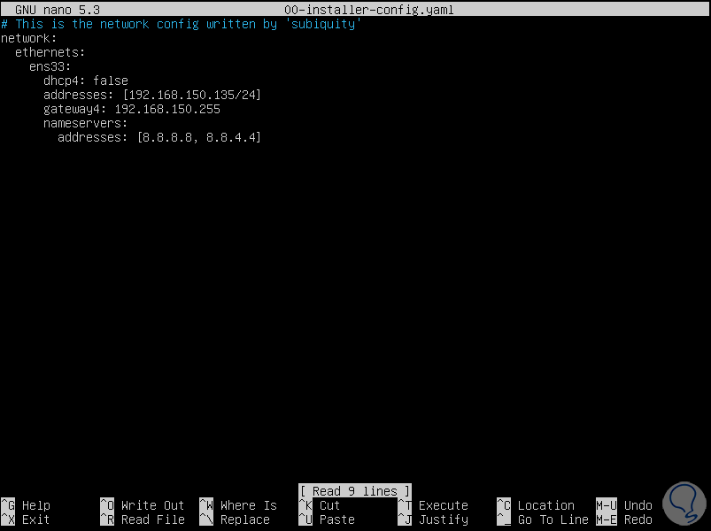 Una vez definido esto, la dirección IP fija es 192.168.150.135, guardamos los cambios con las teclas Ctrl + O y salimos del editor con las teclas Ctrl + X.