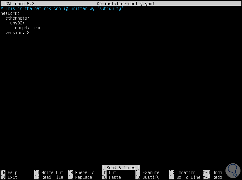 El archivo 00-installer-config-yaml contiene la configuración actual del adaptador de red, usaremos algún editor de texto para acceder a este :