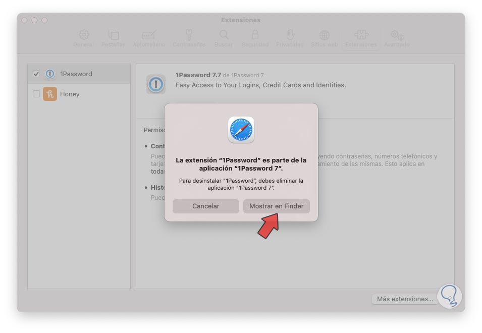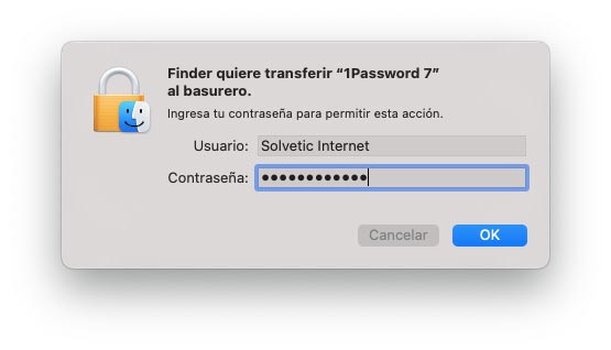 Allí movemos la extensión a la papelera para eliminarla y debemos ingresar la contraseña de administrador local. Clic en OK y así la extensión será desinstalada de Safari en macOS.