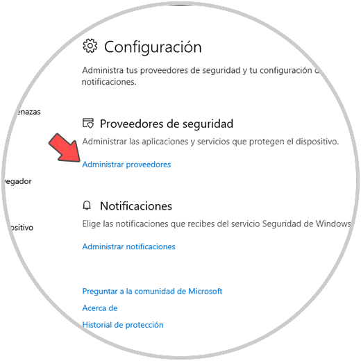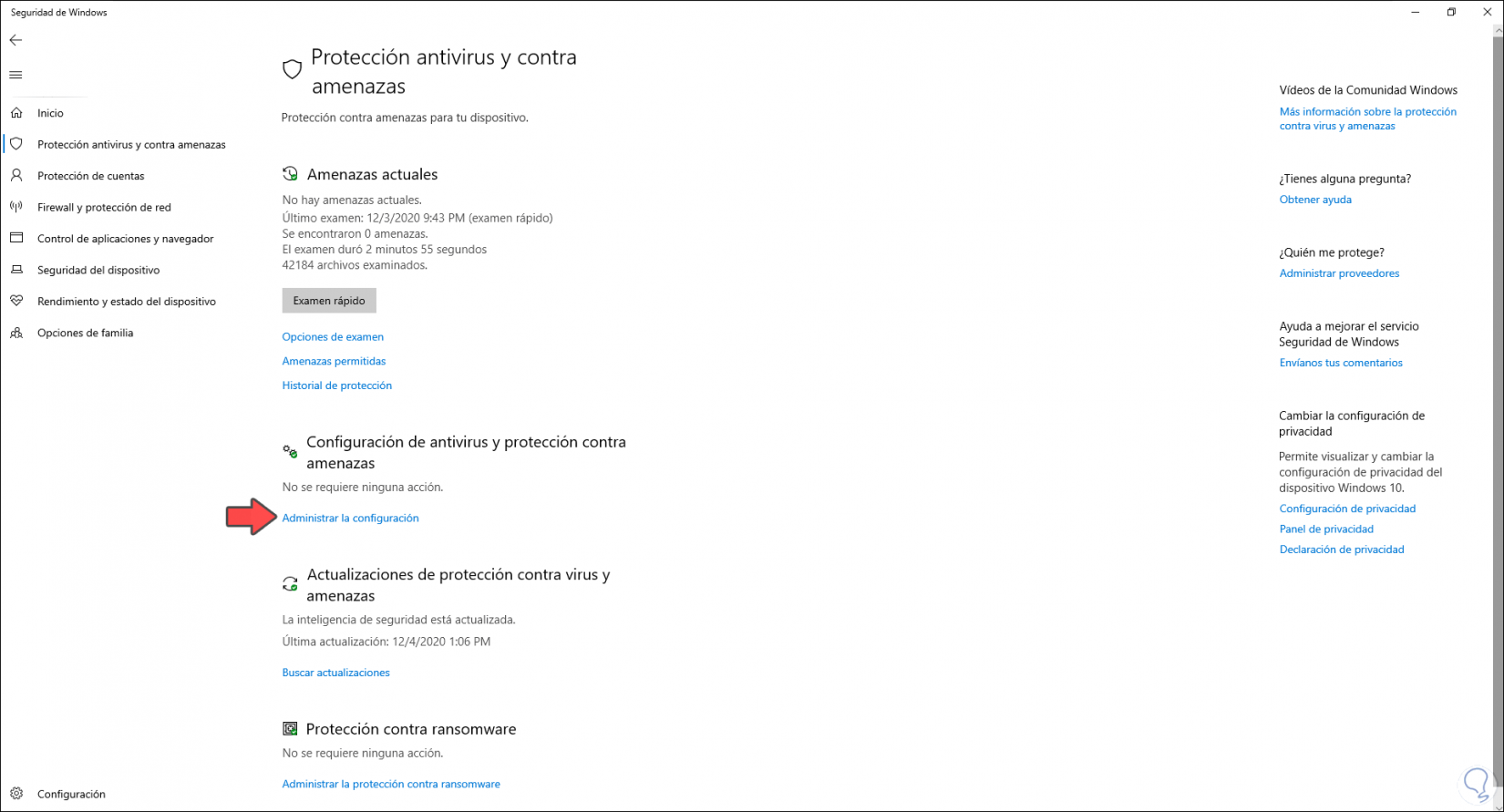 En la nueva ventana vamos a la sección “Protección antivirus y contra amenazas”, veremos las siguientes opciones. Allí damos clic en la línea “Administrar la configuración”
