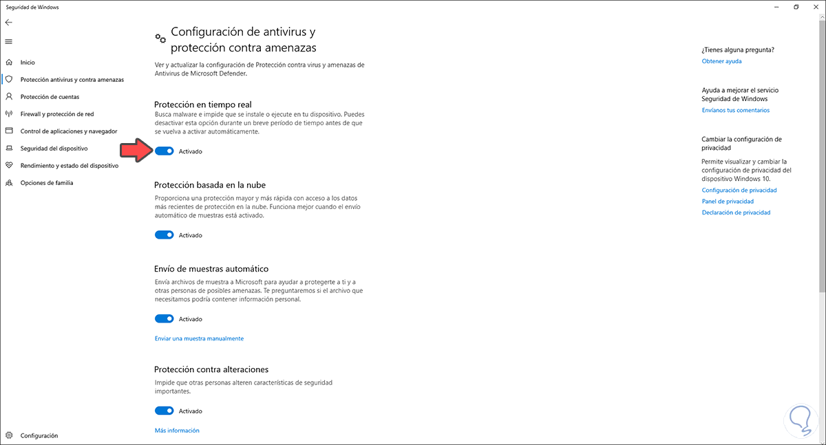 Este será el escenario disponible. Desactivamos el interruptor “Protección en tiempo real”