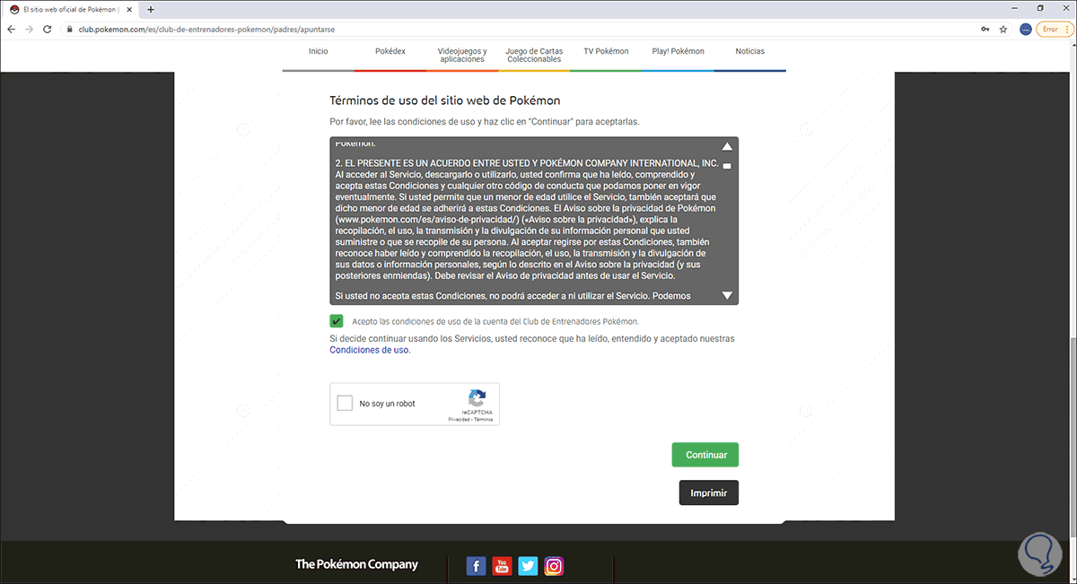 Para completar este proceso debemos activar la casilla del captcha y damos clic en “Continuar”, luego debemos activar la casilla de las condiciones del servicio: