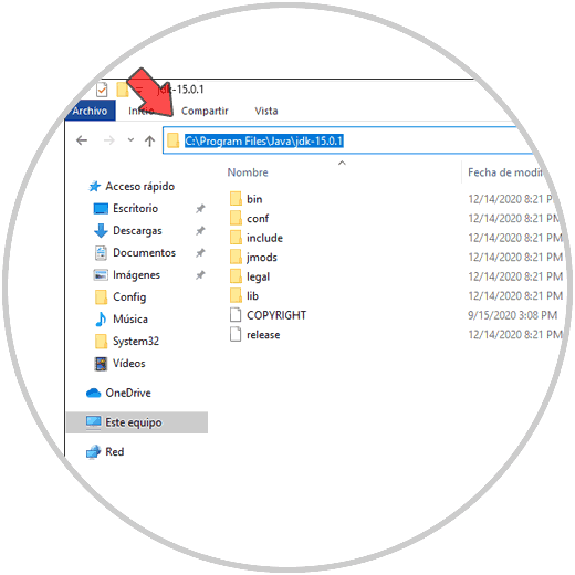 Desde el explorador de archivos de Windows 10, podemos ir a la ruta donde ha sido instalado Java 15, esta ruta es: