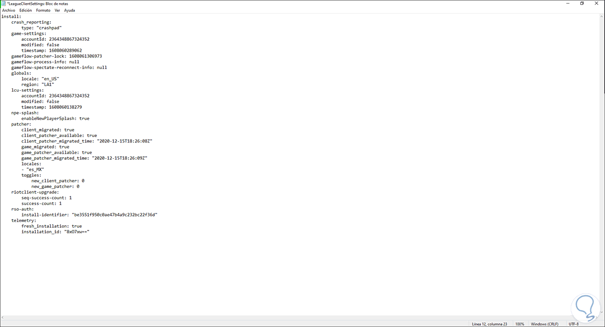Allí debemos centrarnos en la sección “globals”, vemos el idioma actual en la línea “locale”, las opciones de idioma a usar en LOL son: