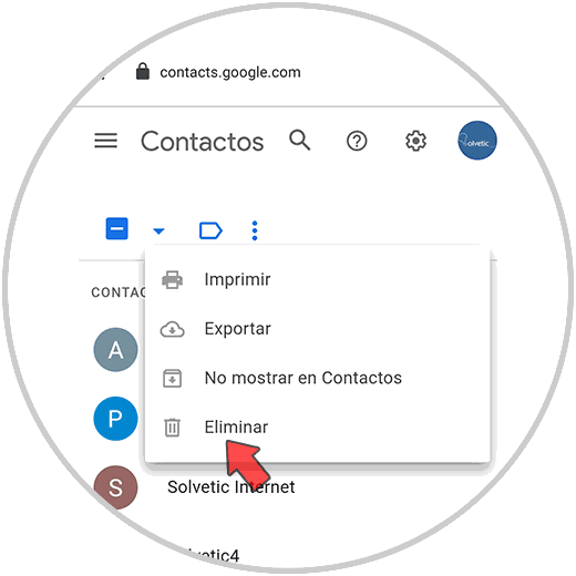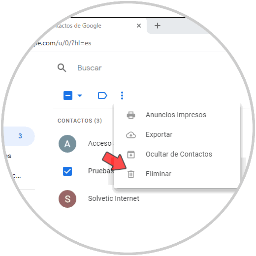 Para un mejor control damos clic sobre la opción Abrir en una nueva pestaña, allí seleccionamos el contacto a eliminar dando clic sobre este, luego vamos al menú contextual donde veremos las siguientes opciones: