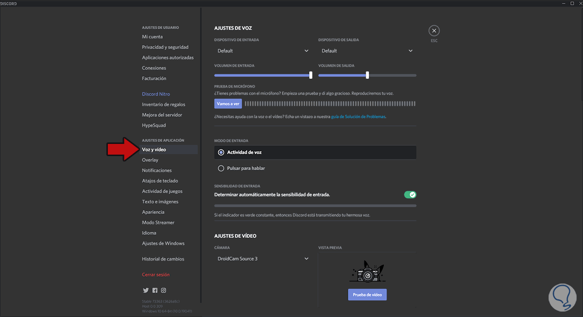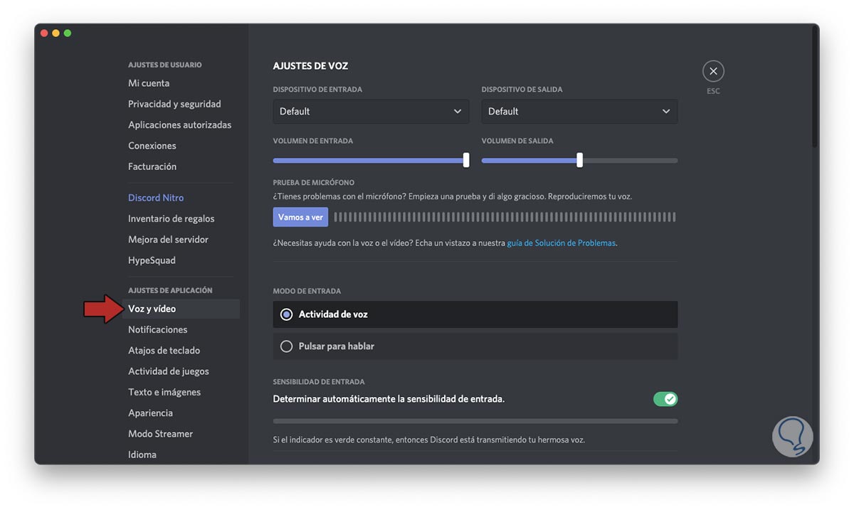 En la ventana desplegada vamos a la sección “Voz y video” y allí debemos confirmar que todo se encuentre configurado de forma correcta: