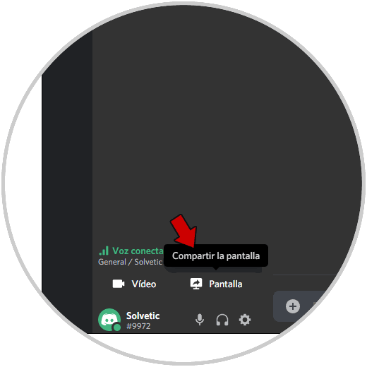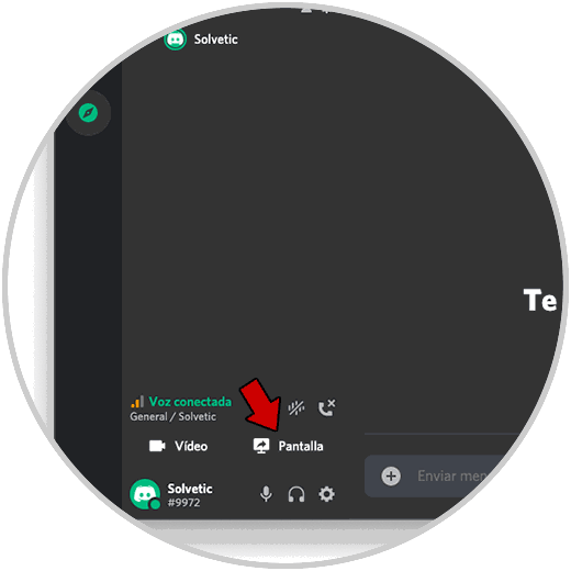 Damos clic sobre el canal de voz disponible y en la parte inferior veremos el botón Pantalla el cual cumple la función de compartir la pantalla: