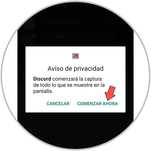 Allí confirmamos la operación dando clic en “Comenzar ahora” y seremos notificados que la pantalla se esta compartiendo en Discord en Android: