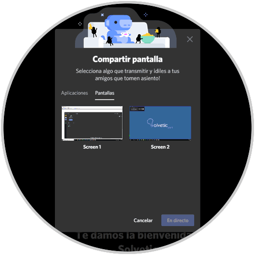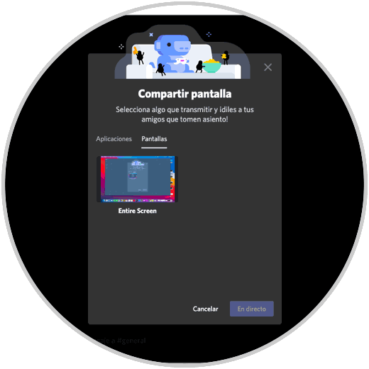 Volvemos de nuevo a Discord y damos clic nuevamente en el canal de voz y clic en “Pantalla” , podemos definir ahora si deseamos compartir las aplicaciones activas o la pantalla: