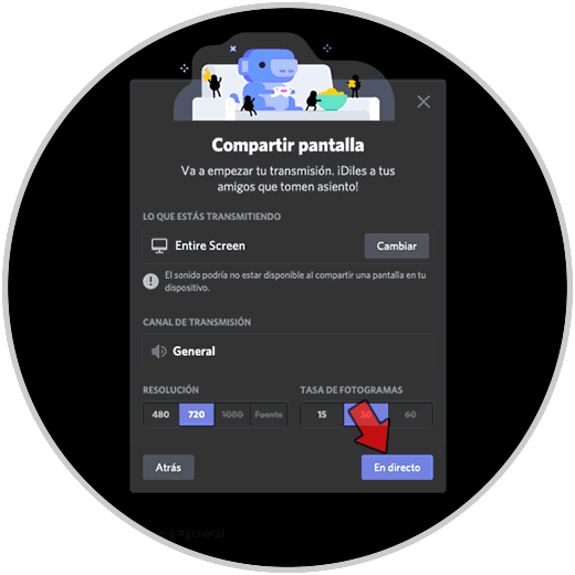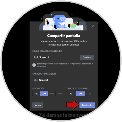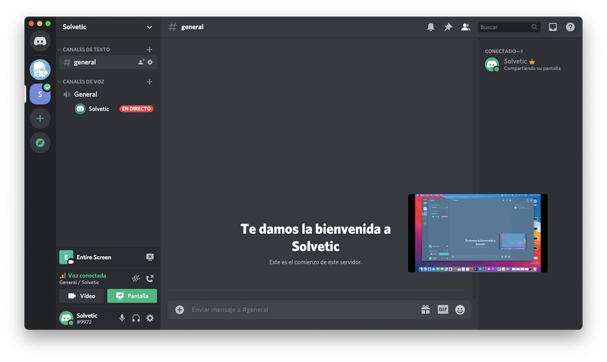 Para iniciar a compartir la pantalla en Discord en macOS, damos clic en el botón “En directo” y se iniciara el proceso: