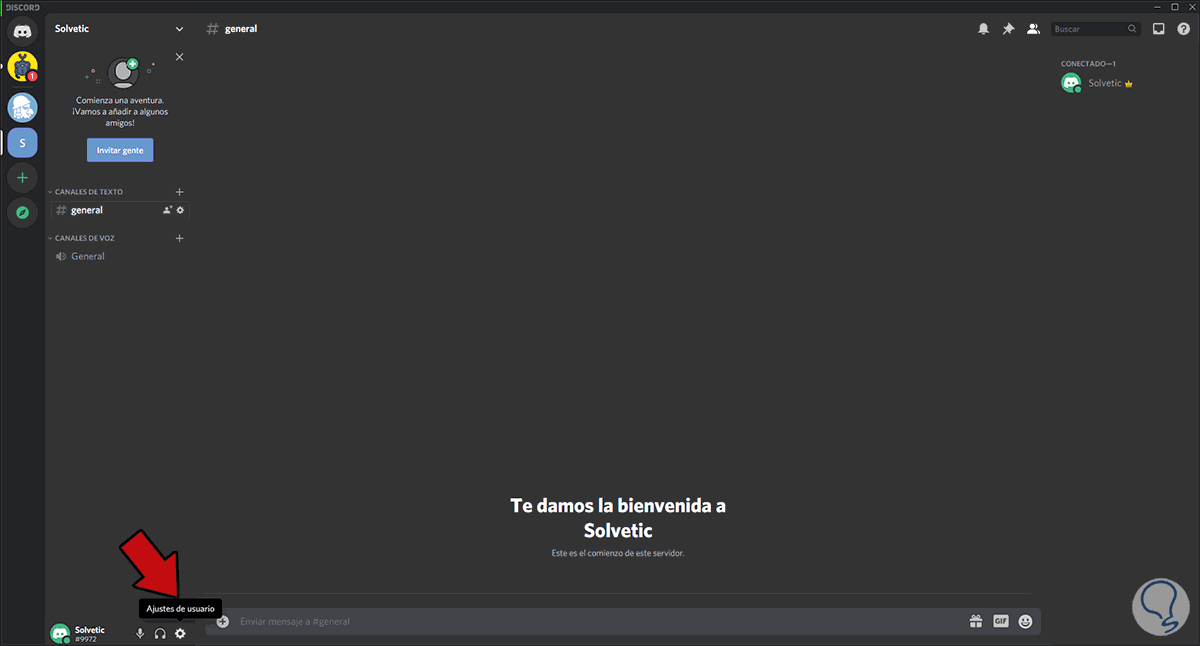 Abrimos Discord en Windows 10 y damos clic en “Ajustes de usuario” ubicado en la parte inferior de la app: