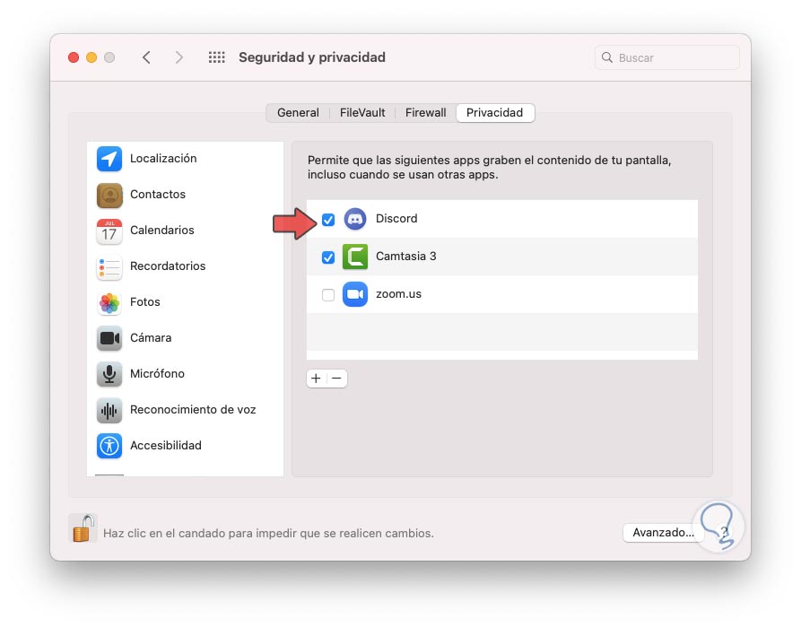 Damos clic en el icono de candado para habilitar los cambios y debemos activar la casilla de Discord: