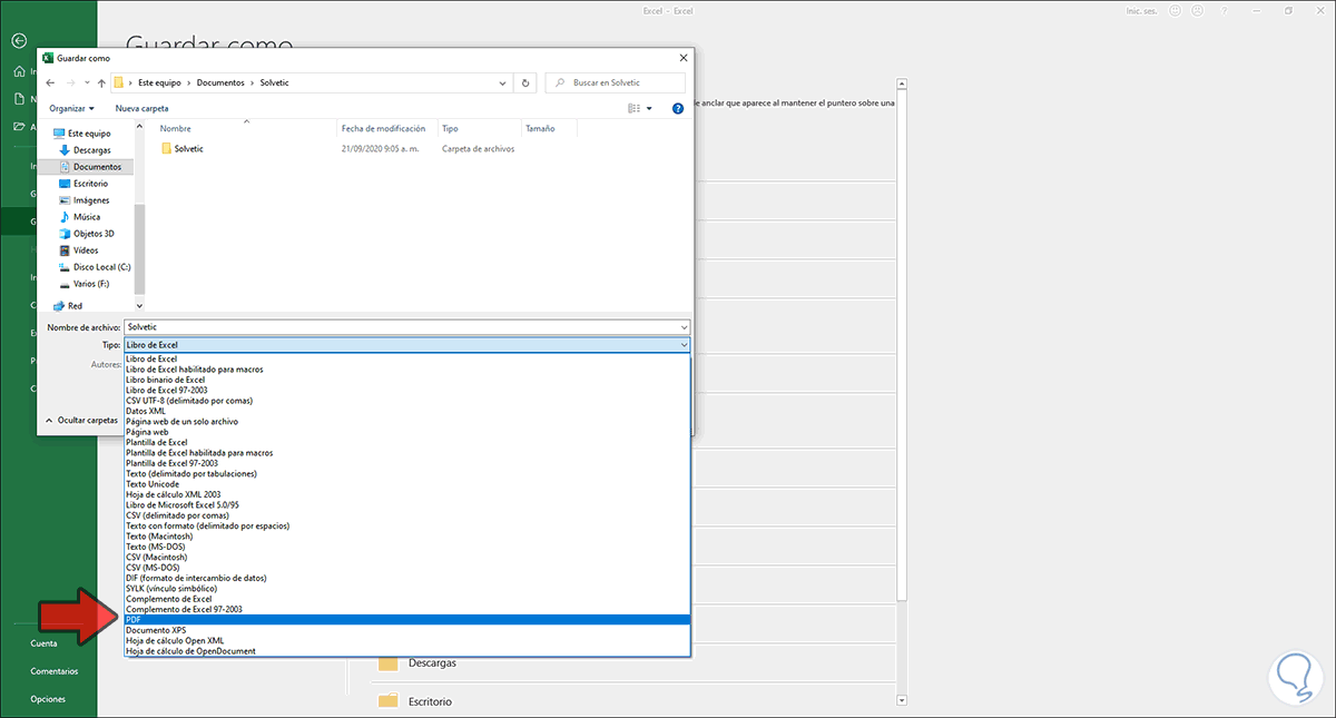 Damos clic en “Guardar como” y en la ventana emergente definimos donde se guardará el archivo, luego vamos al campo “Tipo” y allí seleccionamos PDF: