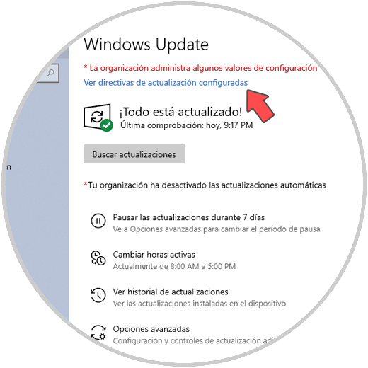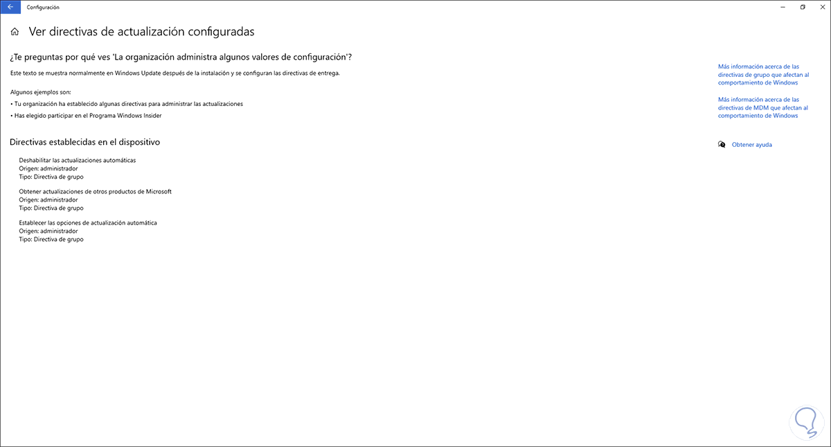 Clic en la línea "Ver directivas de actualización configuradas". Podemos ver la restricción de las actualizaciones automáticas