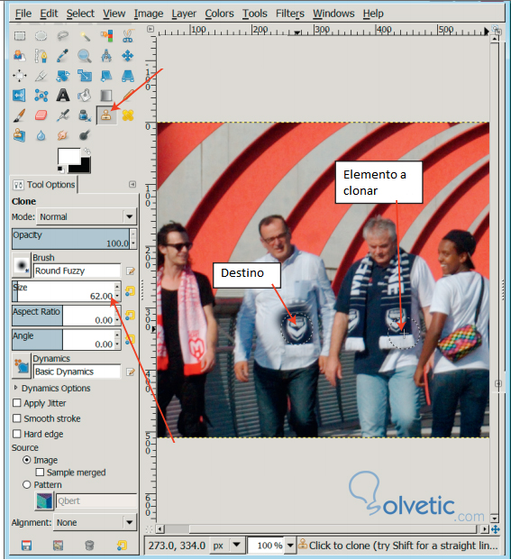 6- Para obtener mayor precisión podemos inclusive ajustar el tamaño de la brocha de clonación, para ello ubicamos la opción tamaño en la barra de herramientas a la izquierda, en la imagen anterior vemos una flecha que la señala.
