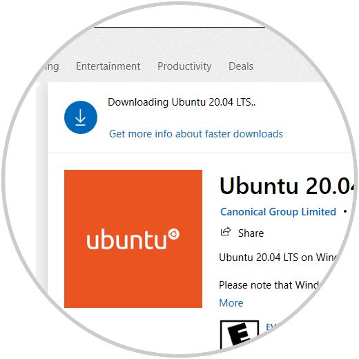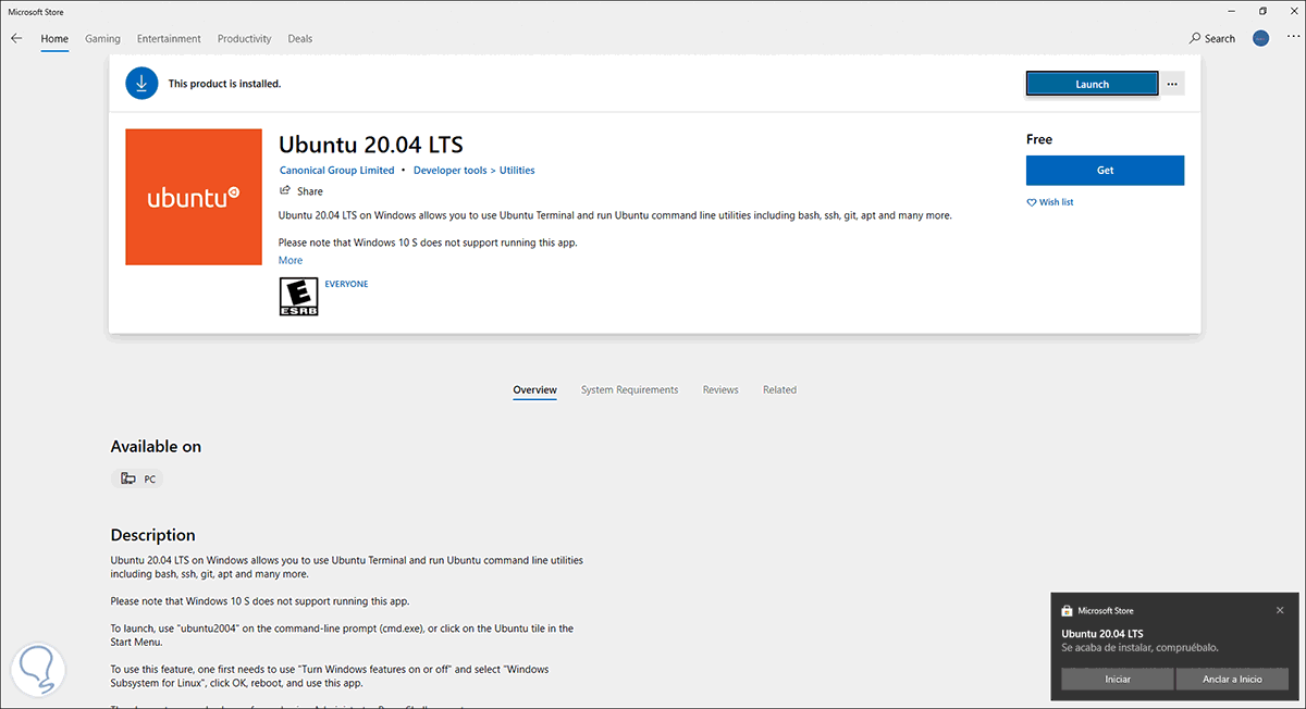 Abrimos la tienda de Windows y allí descargamos alguna de las versiones de Linux compatibles, en este caso Ubuntu 20.04:
