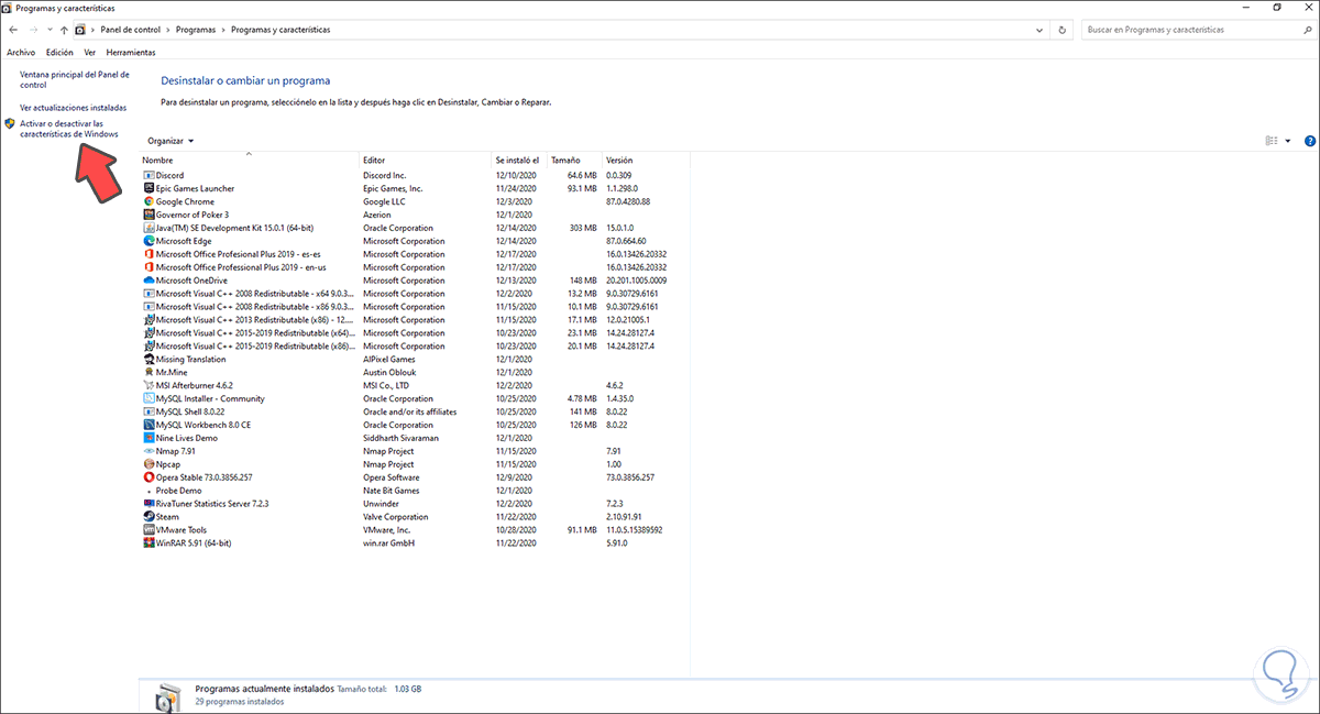 Damos clic en la línea “Desinstalar un programa” y seremos redireccionados a la siguiente ventana: