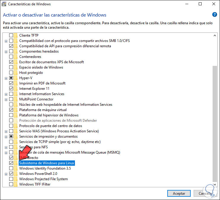 Vamos de nuevo a "Activar o desactivar las características de Windows" y allí comprobamos que las siguientes casillas estén activas: