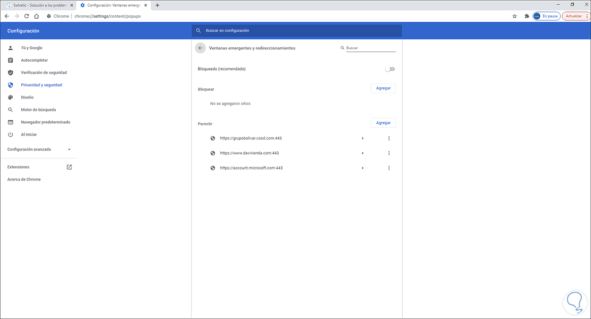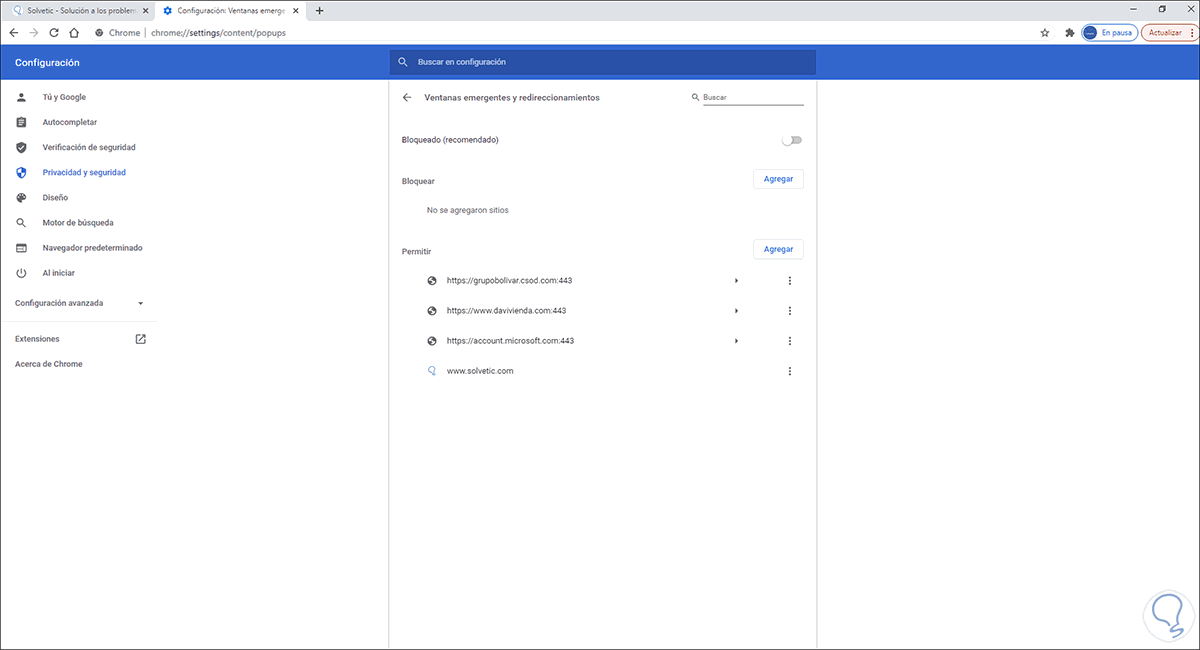 Una de las tantas funciones que maneja Google Chrome es la de las ventanas emergentes, esta es una opción que permite a los sitios que visitamos abrir nuevas ventanas ya sean propias o de terceros, en muchos casos esas ventanas emergentes son publicidad molesta o contenido que puede afectar la integridad del equipo, por estos motivos Solvetic te explicara como permitir o bloquear el uso de estas ventanas emergentes en Chrome.