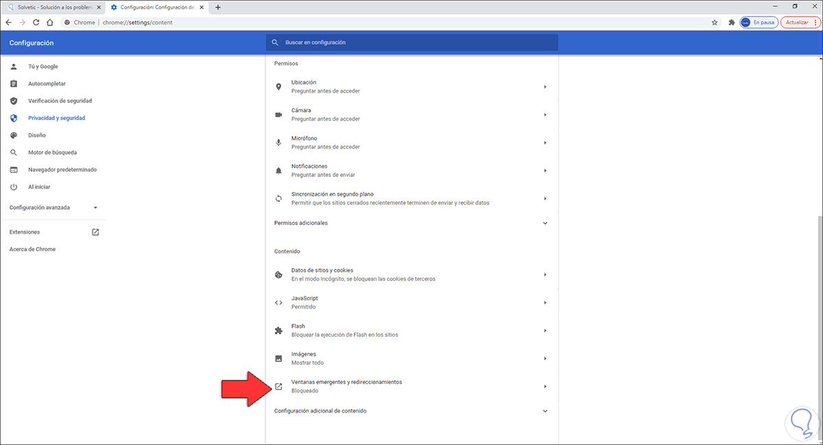 Al dar clic allí podemos bloquear o permitir las ventanas emergentes con el interruptor disponible: