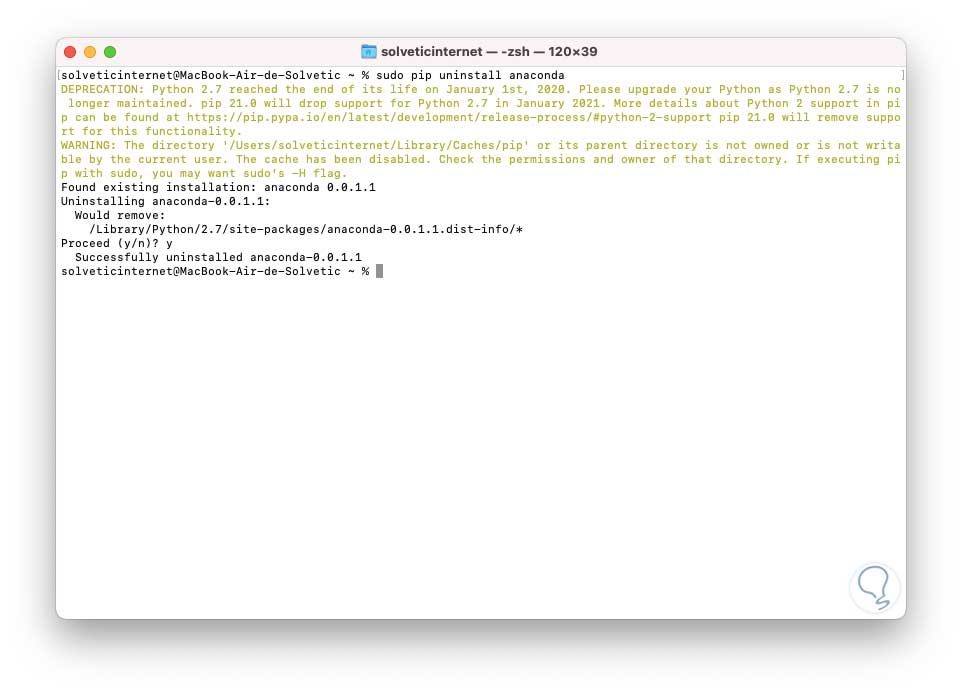 Finalmente, para desinstalar un programa con pip en macOS, ejecutamos la siguiente sintaxis. Al confirmar la acción el programa será desinstalado de macOS.