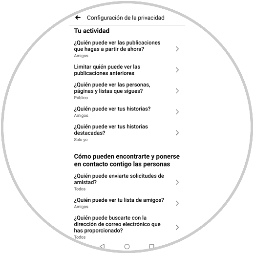 Lo que puedes hacer es ir entrando en todos aquello apartados que quieres configurar tu privacidad, y seleccionar quien quieres que pueda ver este contenido.