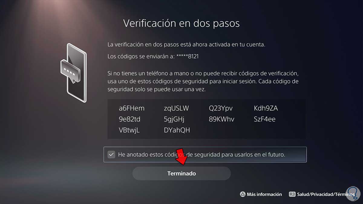 Ahora te aparecerán una serie de códigos que debes anotar para iniciar sesión cuando no tengas a mano tu teléfono. Cuando lo hayas hecho activa la casilla de que los has anotado y pulsa en "Terminado".