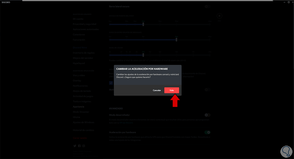 Para deshabilitarla abrimos Discord y vamos a "Ajustes de usuario", luego vamos a la sección "Apariencia" y allí deshabilitamos el interruptor "Aceleración por hardware":