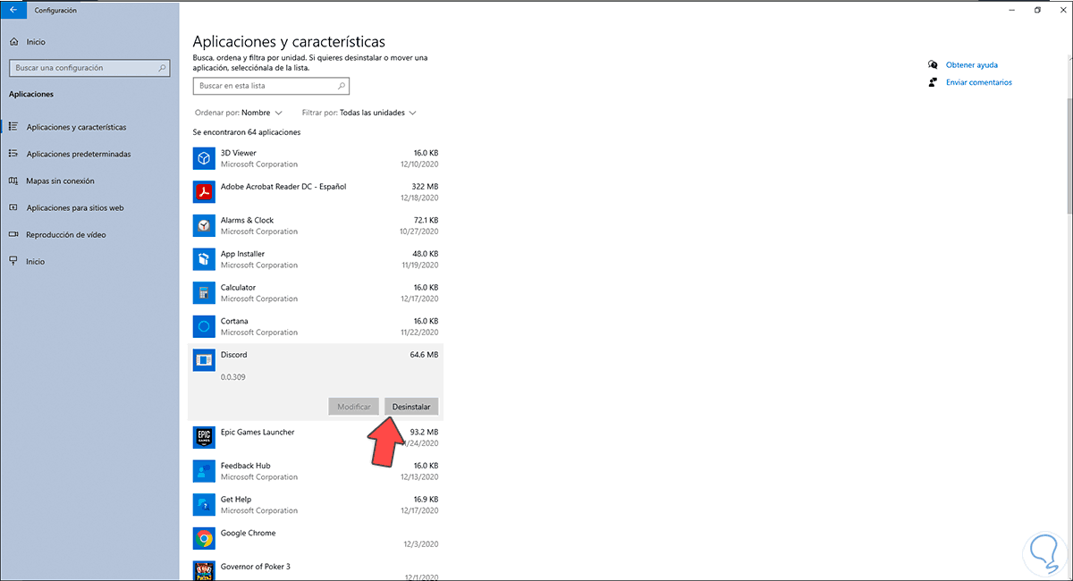 Finalmente podemos optar por reinstalar la aplicación, en primer lugar, abrimos el Administrador de tareas y en la pestaña "Inicio" validamos que Discord no esté disponible o bien deshabilitado. Después de esto vamos a "Inicio - Configuración - Aplicaciones - Aplicaciones y características", seleccionamos Discord y damos clic en "Desinstalar":