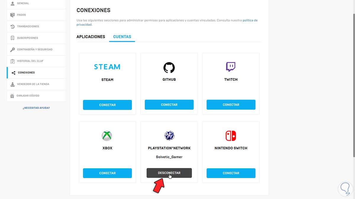 Pulsa sobre "Desconectar en la vinculación con Play Station Network"