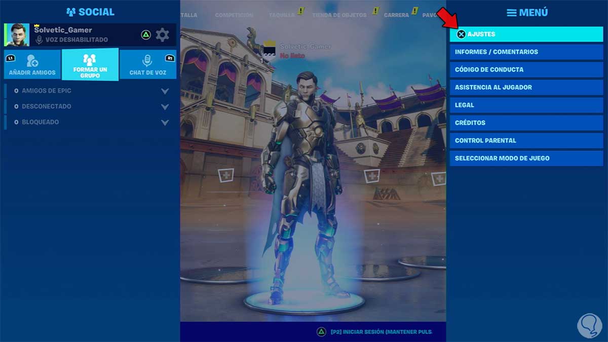 Ahora pulsa el botón de opciones y accede a los "Ajustes" del juego en el que te encuentres. En este caso será Fortnite.