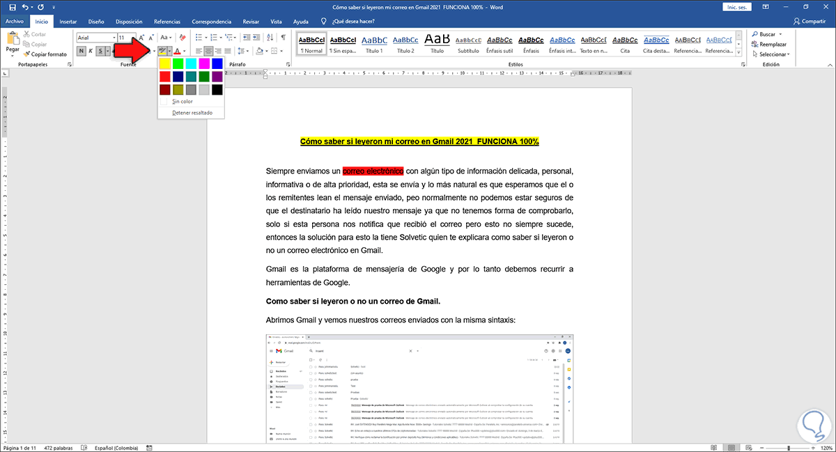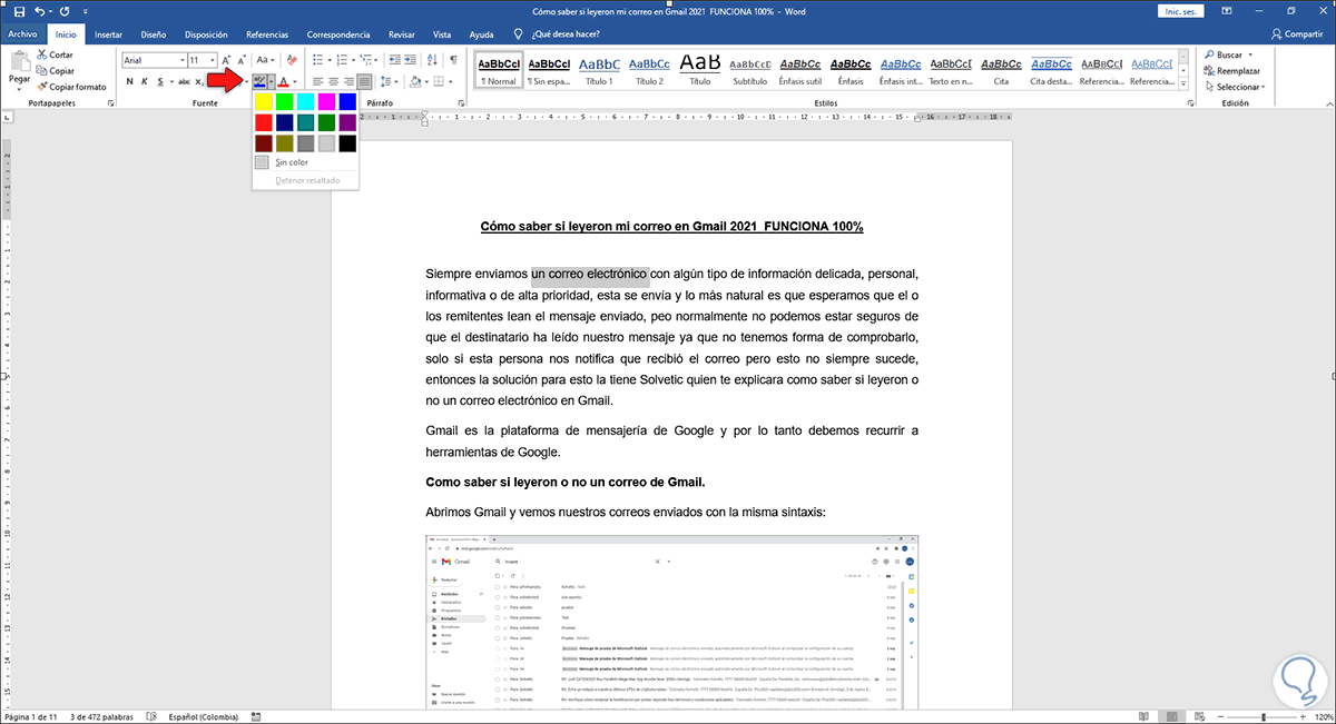 Da clic en la opción “Sin color” y todo el texto resaltado se borrará: