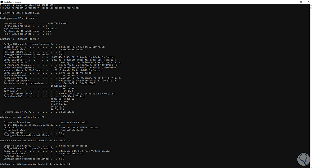 Adicional a esto, podemos acceder a CMD y ejecutamos "ipconfig /all":