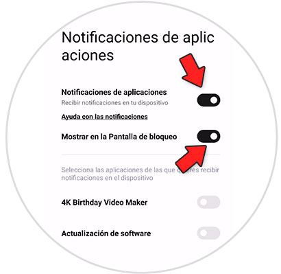 La pestaña de “Notificaciones de aplicaciones” y “Mostrar en la pantalla de bloqueo” deben estar activas.