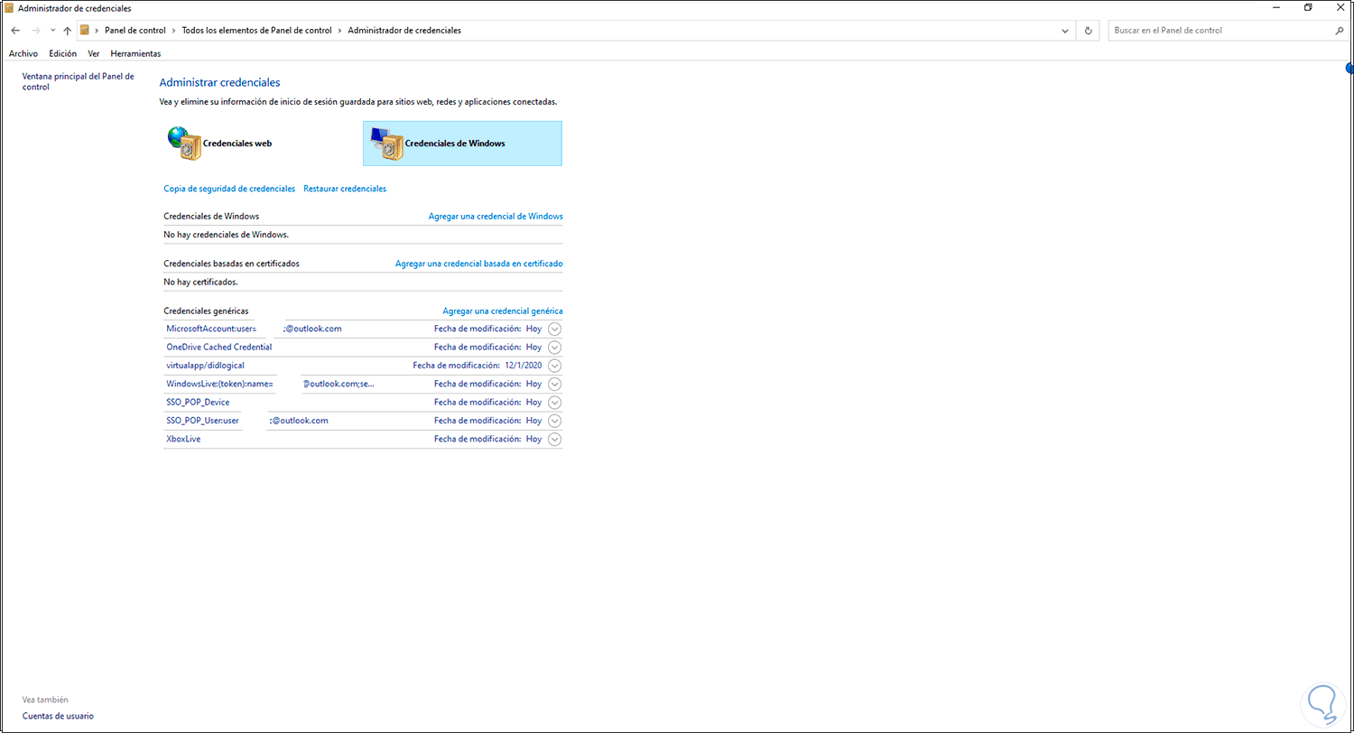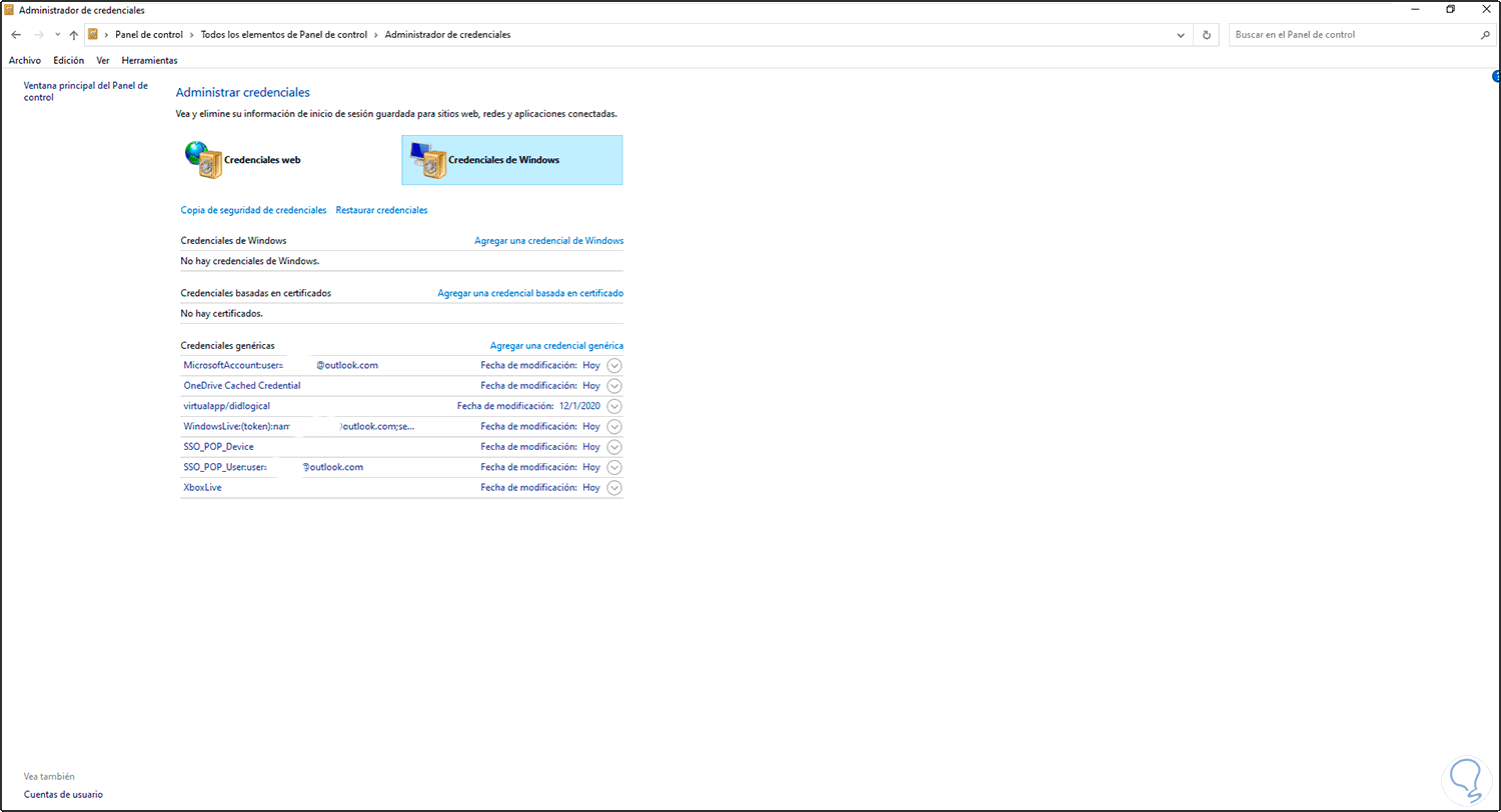 Damos clic en "Administrador de credenciales", en la siguiente ventana vamos a "Credenciales de Windows", veremos lo siguiente: