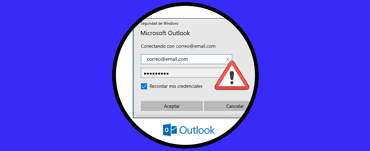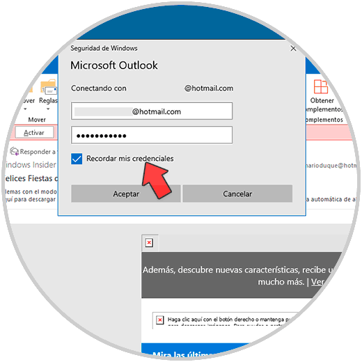 Abrimos Outlook de nuevo y esta vez ingresamos la contraseña y activamos la casilla "Recordar mis credenciales". Clic en Aceptar y así ya no veremos más este mensaje constantemente.