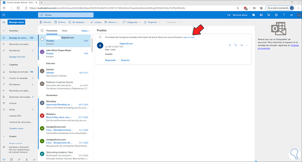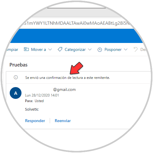 Abrimos el correo del destinario y en el correo vemos que se solicita confirmación de la lectura en la parte superior de este: