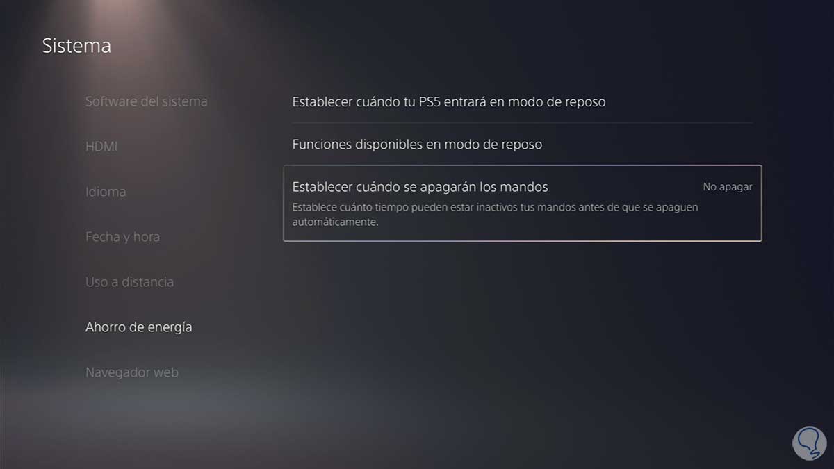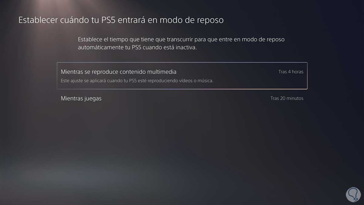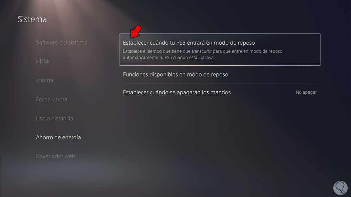 Lo siguiente será en pulsar "Establecer cuando tu PS5 entrará en modo reposo" para configurar esto.